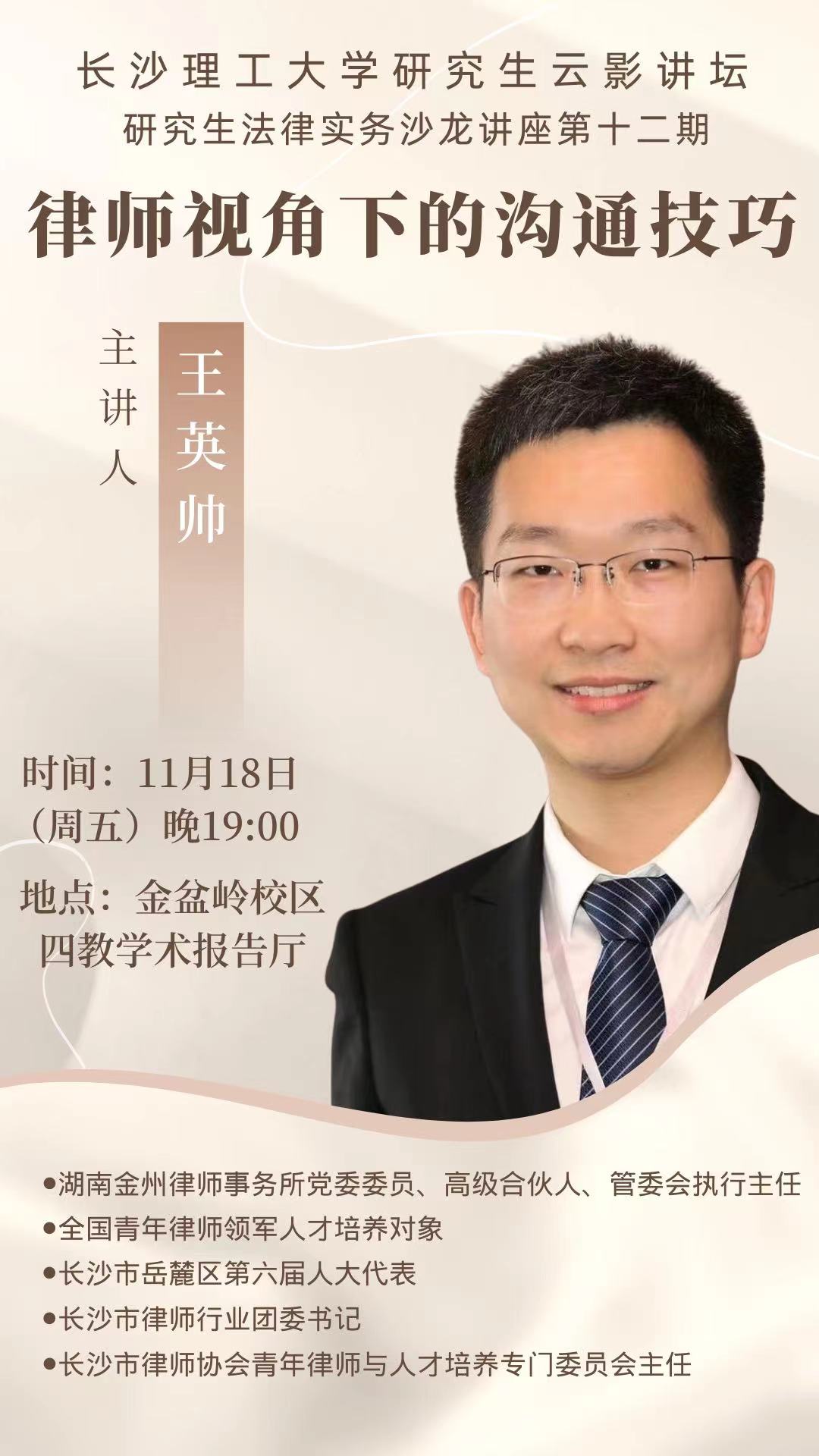 为拓展学生法律视野,提升青年学生的综合能力,11月18日,304am永利集团法学院“云影讲坛研究生法律实务沙龙”第十二期如期举行。本期以《律师视角下的沟通技巧》为主题,由湖南金州律师事务所王英帅律师主讲,我院杜卫红老师担任讲座主持人,我院田兴洪书记出席本次讲座,240余名学生聆听讲座。