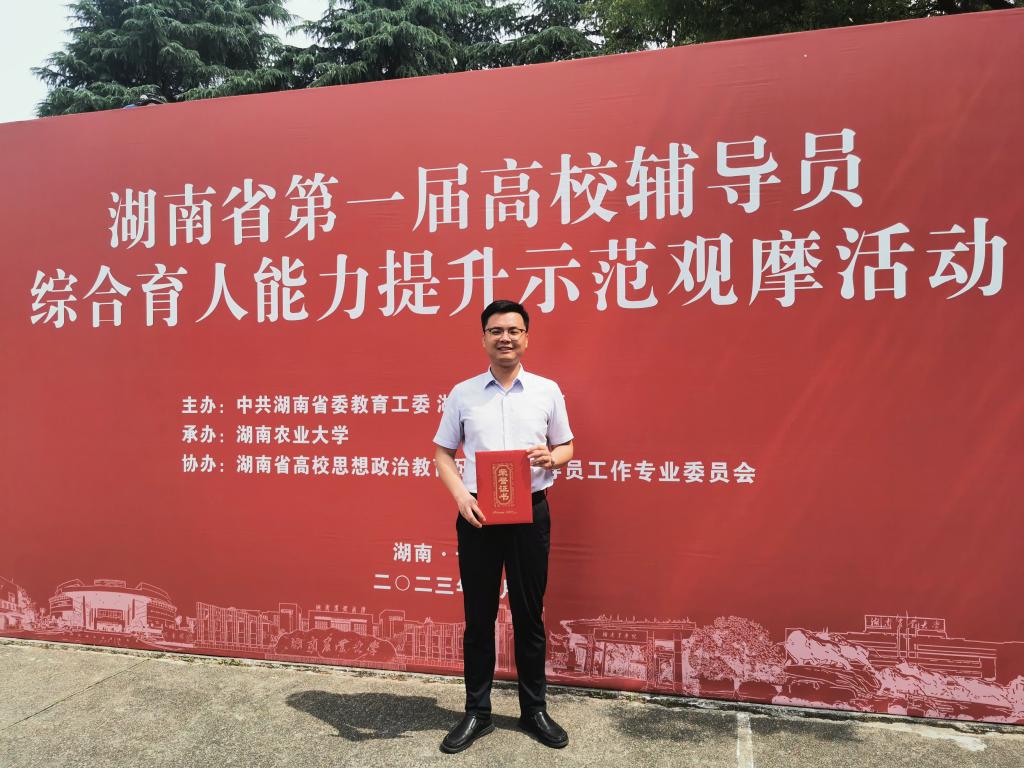 为深入贯彻落实习近平新时代中国特色社会主义思想和党的二十大精神,进一步推动全省高校落实立德树人根本任务,5月22至25日,湖南省第一届高校辅导员综合育人能力提升示范观摩活动在湖南农业大学举行,我院辅导员刘阳等奖(全省第四名)。