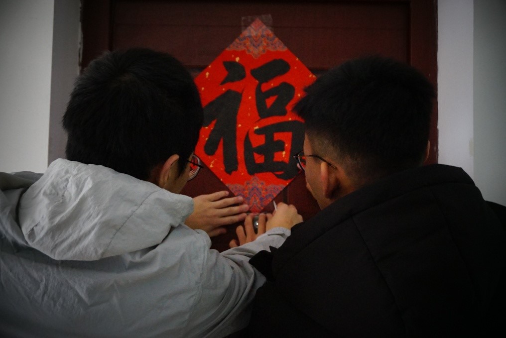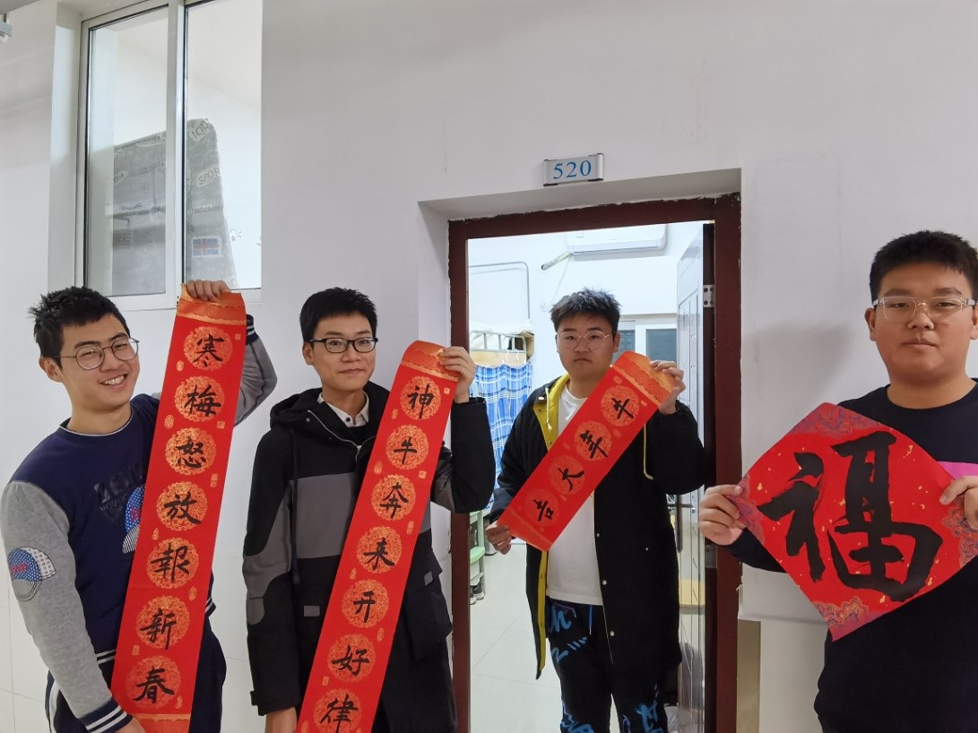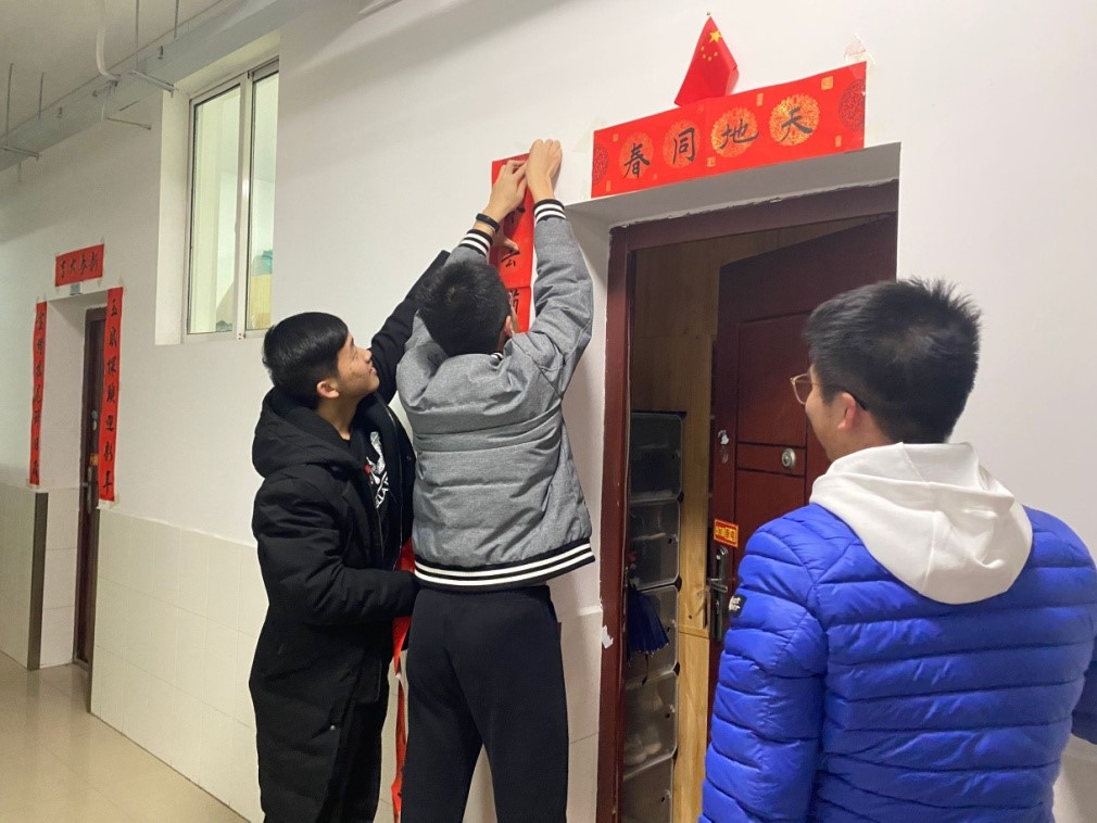 临近寒假,304am永利集团2019级教学改革试点班的曲梓涵、梁礼武自习回来,看到学弟正在宿舍门口贴春联,送来新年礼物,他们一边帮忙贴好春联,一边感慨“学弟学妹太暖心!卡片和糖果太甜了!”