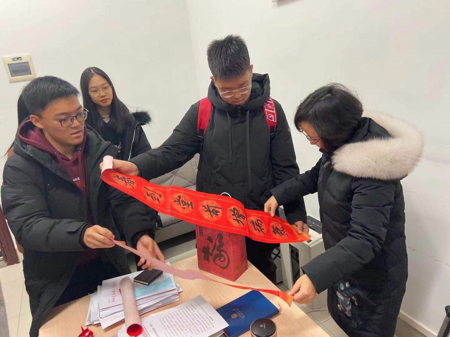 临近寒假,304am永利集团2020级教学改革试点班的每一名学生都成为了“惊喜小分队”的一员,把寄托着祝福的手写春联、手工卡片和年历等礼物,送到了老师们的办公室、教室和学生宿舍里,其中100幅春联、50个“福”字都是由班上的团支书赵胜祥同学书写完成。