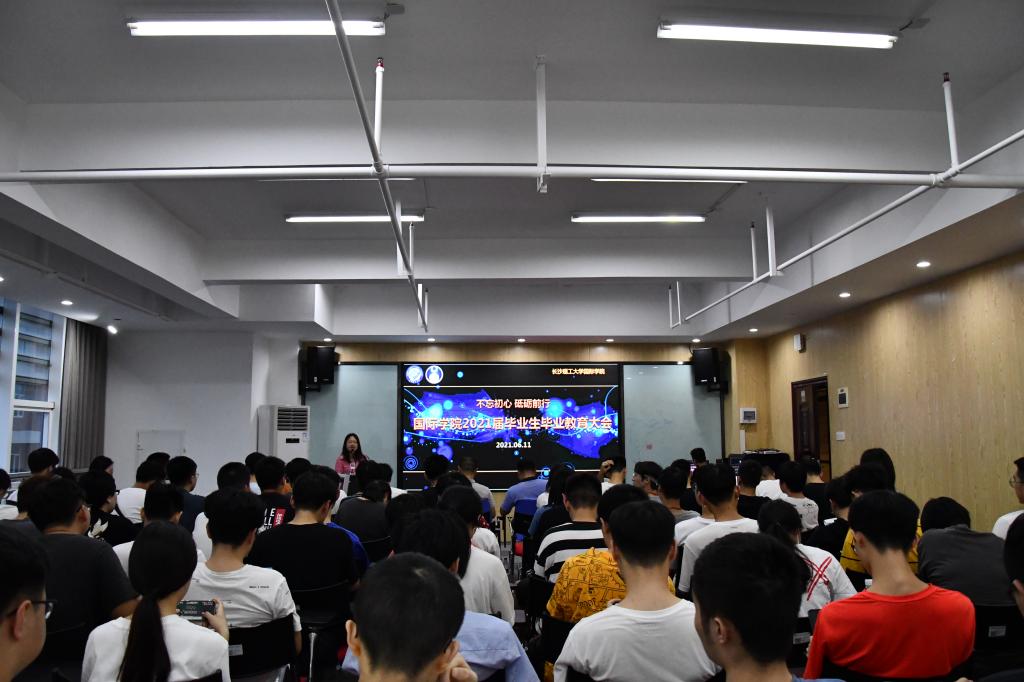 为进一步做好学院2021届毕业生教育与管理工作,保证毕业生安全、顺利离校,6月11日晚19点,国际学院在新能源大楼一栋402报告厅召开不忘初心、砥砺前行——国际学院2017级毕业生毕业教育大会。院党总支副书记兼副院长乔法光、副院长秦卫星,学工办辅导员,以及2021届全体毕业生参会,会议由辅导员易芙蓉主持。