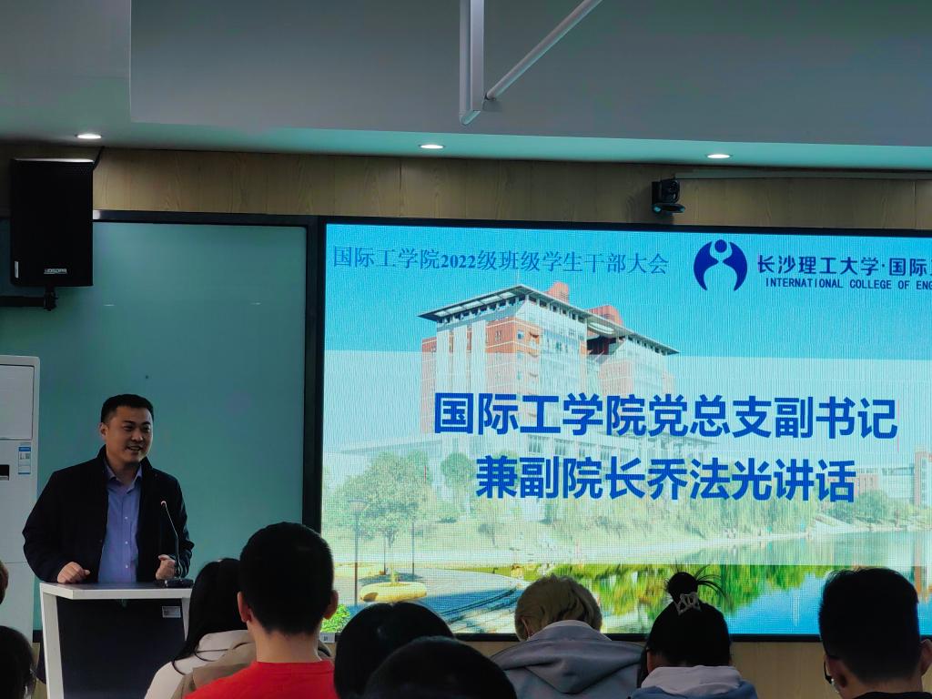 3月3日中午,国际工学院2022级新学期班级学生干部大会在云塘校区新能源大楼1栋4楼会议室召开。学院党总支副书记兼副院长乔法光、2022级全体辅导员和班级学生干部参会。