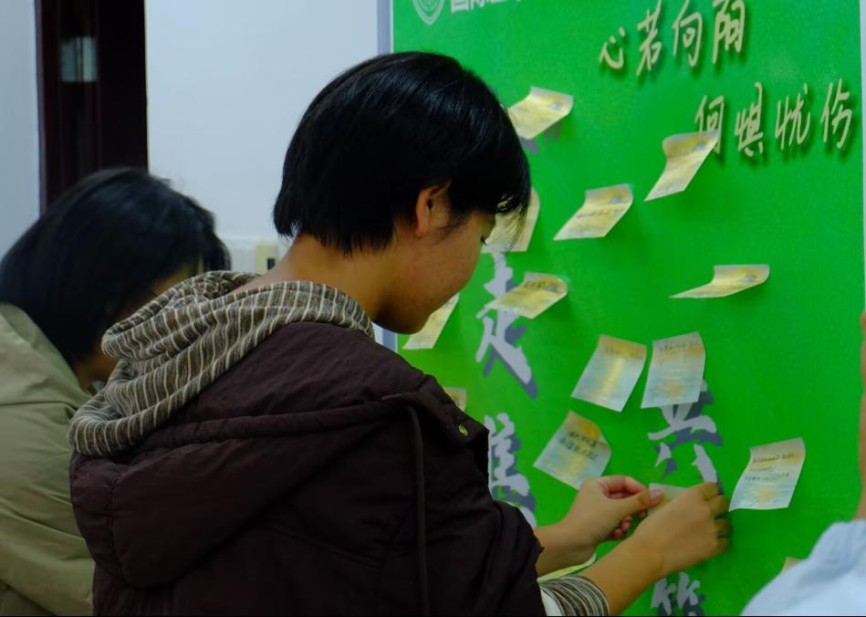 活动现场,同学们通过参与趣味游戏和心理健康知识问答,赢得自己心仪的盆栽,并为每盆植物精心设计养护卡片,在上面写下了对未来的祝福和对生命的感悟。“生命不泯灭于泛泛,我在绿意中重生”,这些来自卡片上温暖的字句透露着同学们对生命、自我的关爱,表达了对未来的期待。“领养的这盆多肉就像是我的心情写照,我会好好呵护它,看着它茁壮成长,我的心情也会越来越好”,这些活动留言也传递出与绿植一样蓬勃向上的力量。此外,活动现场还设置了心理健康知识展板、情绪表达墙和手工制作区,为同学们提供了更多了解心理健康知识、表达内心情感的机会。