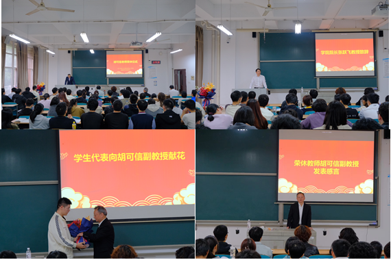 学生代表焦明准同学为胡可信老师献花,学生代表谭心同学深情讲述从胡可信老师的言传身教中学到的点点滴滴,并代表全体同学衷心祝福老师退休快乐,生活美满,平安健康!胡老师在退休感言中回顾了自己从入职到退休的心路历程,感谢学院领导的关怀,同事的帮助和同学们的认可,表达了对学校、学院、学生发展的殷切期盼。最后,张跃飞院长代表学院为胡可信老师赠送荣休纪念品,全体师生合影留念。