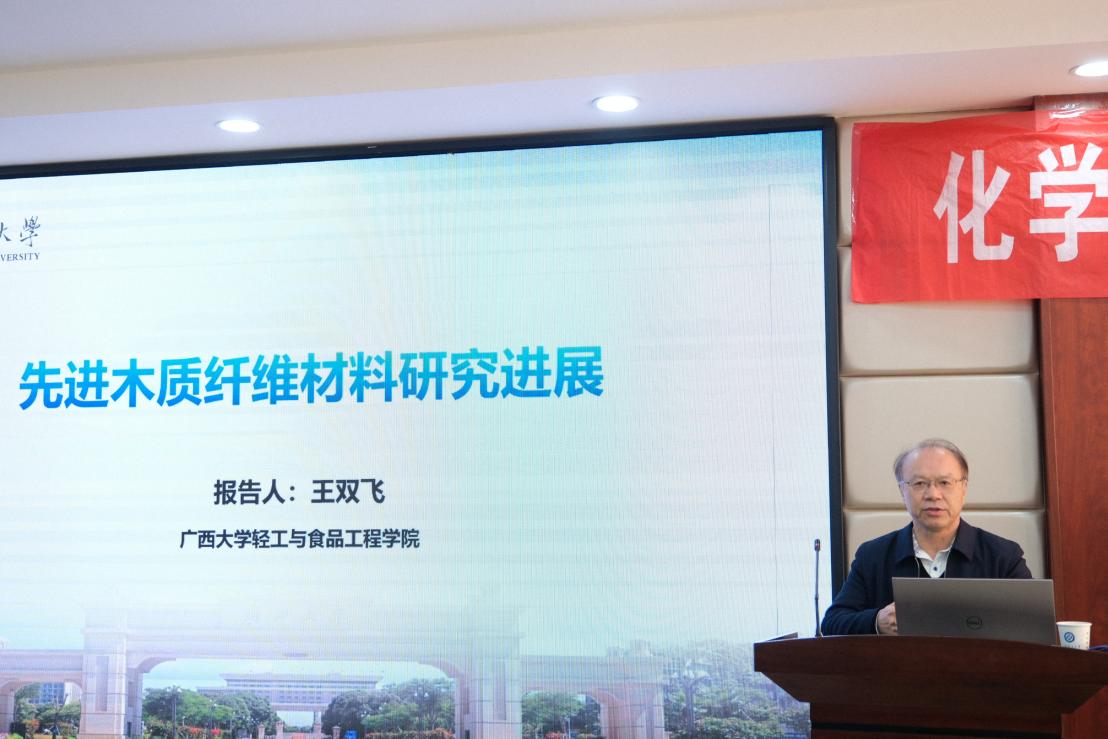 报告会上,王双飞院士从制浆造纸行业面临的低碳化和高值化这两大挑战的背景下深刻阐述了功能化先进木质纤维素材料在助力制浆造纸产业转型升级的重要意义,列举了国内外课题组在木质纤维素预处理、纳米纤维素制备及其在柔性电子设备、生物医药、能源和环境治理等领域上的研究进展。王双飞院士还介绍了他的研究团队紧密围绕先进木质纤维原料的基础研究,对纤维素摩擦电材料构筑及先进应用、木质纤维表面功能基团分布调控、木质纤维基碳量子点构筑、用于公共安全检测的智能传感试纸及包装场景下的特种纸开发等研究方向进行了深入的探索,取得了丰硕的科研成果。在讲解过程中,王院士结合自身对制浆造纸行业的认识,与师生们一同展望了纤维素基材料在服务国家重大战略中的“着力点”,鼓励师生们要树立远大的科学理想,在挑战和沉淀中积累专业知识和技能,努力将个人发展同国家需求紧密联系在一起。