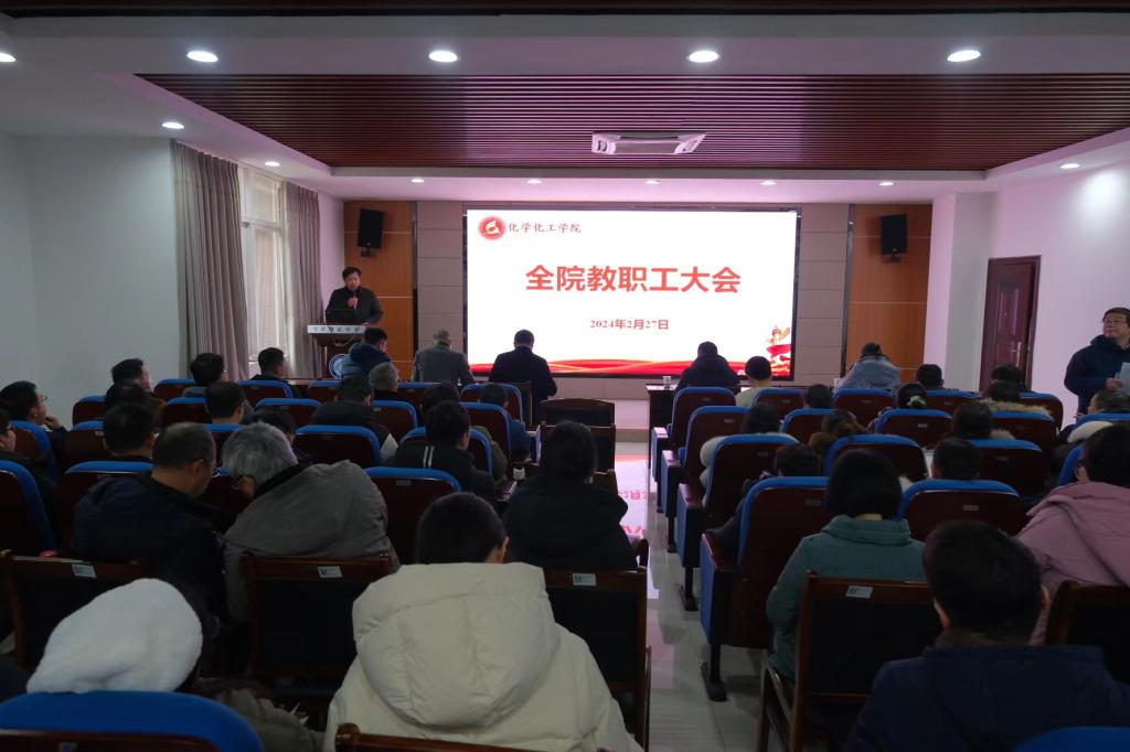 为了扎实做好新学期各项工作,确保开学工作平稳有序高效进行,2024年2月27日下午,化学化工学院在新能源大楼3B栋301分析测试中心报告厅召开了本学期第一次全院教职工大会。学院党政领导班子和全体教职工参加会议,会议由党委副书记、副院长任艮丰主持。