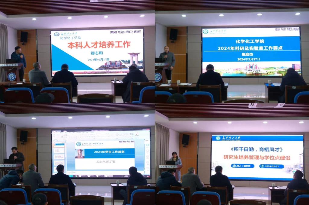 副院长卿志和介绍了下一阶段本科人才培养工作方面需要注意的要点,明确以本科教育教学审核评估整改为重点,扎实基本盘,做好日常教学、监考、专升本等方面的工作。副院长陈启杰对学院科研及实验室安全方面的工作进行了相关部署,并定下了新一年的科研目标;副院长喻林萍对研究培养管理及学位点建设工作进行了介绍,强调要做好今年化学一级博士点的申报工作,并在相关节点进行研究生招生的线上、线下宣讲工作;任艮丰做了2024年学生工作的规划,提出要做到六个“抓好”,即抓好日常安全、抓好学风建设、抓好竞赛工作、抓好党建发展、抓好队伍建设、抓好平台管理。