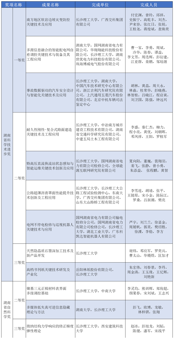 永利官网12项成果获湖南省科学技术奖。其中,永利官网教师以第一完成人获湖南省科学技术一等奖3项(科技进步奖),二等奖4项(科技进步奖3项,自然科学奖1项),三等奖2项(科技进步奖1项,自然科学奖1项);永利官网作为参与单位获湖南省科学技术进步奖二等奖1项,获湖南省科学技术进步奖三等奖1项,获湖南省自然科学奖二等奖1项。