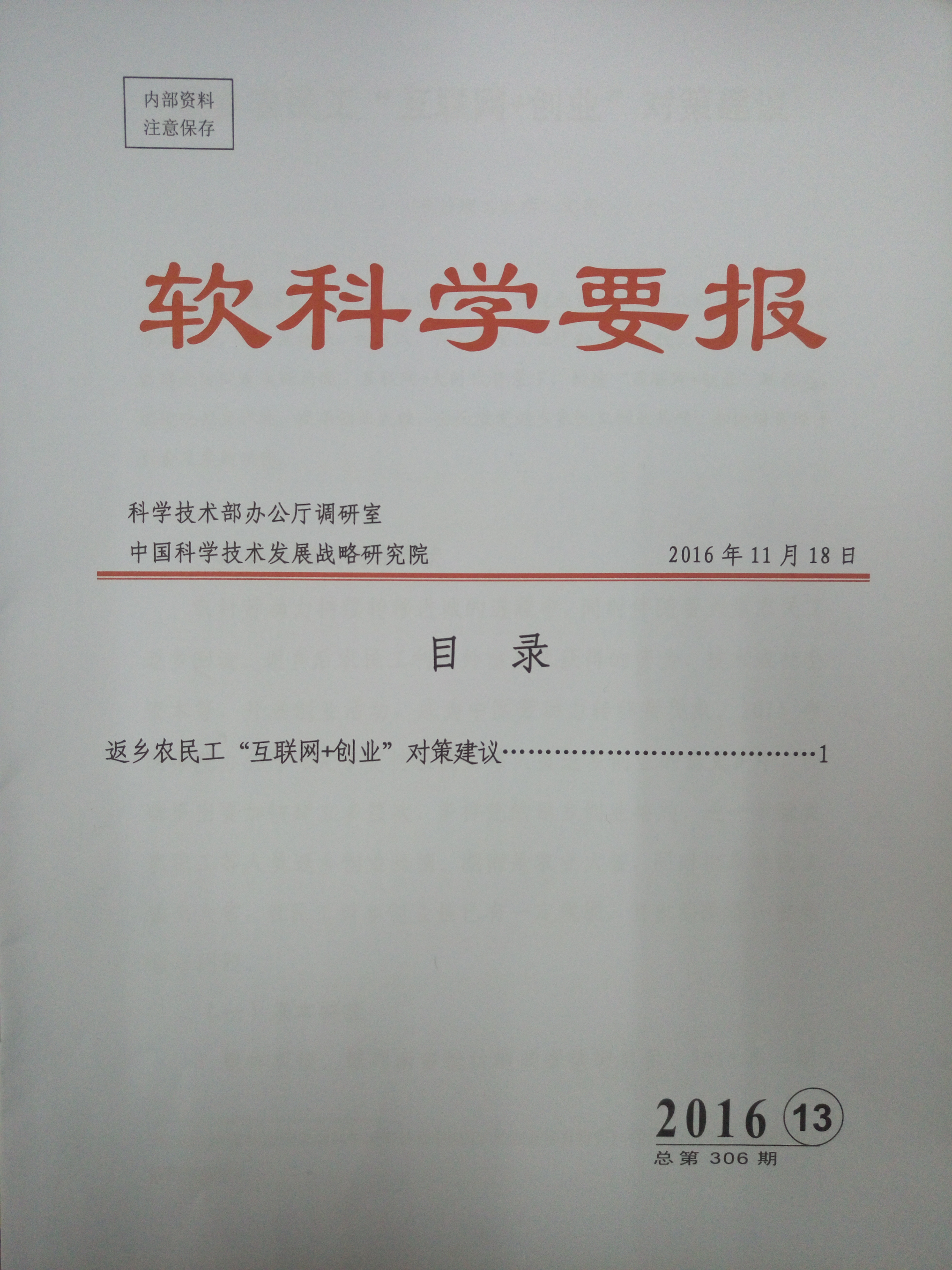 近日,由永利官网经济与管理学院文亮教授主持的国家软科学项目《中国农民创业培育研究》的成果--《返乡农民工“互联网+创业”对策建议》,成功入选了《软科学要报》2016年第13期。实现了永利官网软科学研究成果被科技部采纳的突破。
