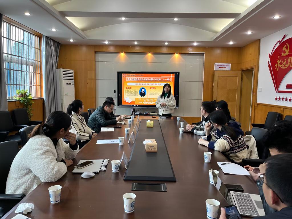 沙龙嘉宾青年教师范辰(青教赛湖南省二等奖获得者)、胡韩莉(创新赛湖南省二等奖获得者)先后作了主题为“教学竞赛助力教学能力提升”的分享,着重介绍了青年教师如何对标青教赛和创新赛等重要教学大赛,来提升自我的教学素养和能力,滋养教学情怀,与学生们教学相长、共同进步。在场青年教师们与嘉宾以及参会领导们作了热烈的交流,沙龙持续了三个多小时。