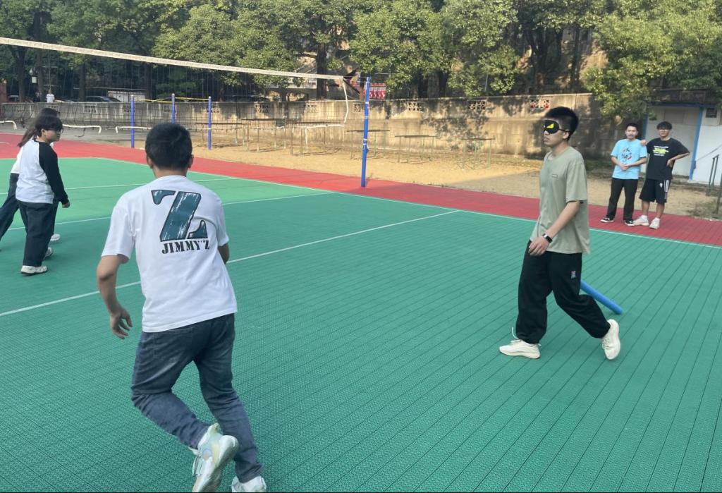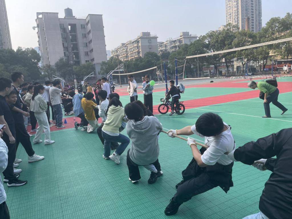 上午,丢沙包比赛拉开了趣味运动会的序幕,现场气氛异常热烈。每当沙包险之又险地从同学们身边掠过,现场都会爆发出一阵阵惊叹与掌声。下午则开展其余四项活动,在蒙眼铃铛打人比赛的比赛过程中,戴眼罩的同学全神贯注地倾听铃铛声,然后迅速出手攻击,而其他同学则小心翼翼地躲避,现场充满了紧张刺激的氛围。其中一名同学巧妙地利用场地角落躲避攻击,在场观众纷纷为他的机智鼓掌。在你画我猜的比赛现场,比划者们全力以赴,用夸张而生动的动作诠释着一个个词语。猜词者则认真思考,积极调动自己的想象力去猜测词语,展现出同学们之间的默契。同学们在一旁看着不时发出欢快的笑声,也被选手们的这份欢乐所感染。背对背气球赛跑比赛中,同学们齐心协力,两两之间紧密配合,努力保持气球的平衡。有的小组在气球掉落时,迅速返回起点重新运输,毫不气馁。其中第4组在运输过程中遇到困难,但他们通过相互鼓励和调整姿势,最终成功将气球运到终点,周围同学为他们欢呼。拔河比赛现场,同学们团结一心,紧握拔河绳。随着裁判的一声哨响,双方队员都使出浑身解数,红带在中线附近来回移动,现场的加油声震耳欲聋。在比赛的关键时刻,一方队伍突然发力,将红带拉过边界,赢得比赛,现场响起连绵不断的欢呼声