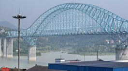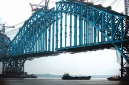 刚性吊杆作为一种常用吊杆形式,近年来在大跨度钢箱拱和钢桁架拱桥中得到广泛应用,国内采用刚性吊杆的典型拱桥有佛山东平大桥、重庆宜万铁路万州长江大桥、南京大胜关长江大桥、江西九江长江大桥(见图1)等。与采用高强度钢丝或钢绞线的柔性吊杆结构相比,刚性吊杆的几何、物理特性有明显的差别,刚性吊杆的线密度、轴向和弯曲刚度较大;刚性吊杆边界条件复杂,且振动频率对边界条件非常敏感;而且由于抗风的需要,刚性吊杆上一般都留有抗风的孔洞。这就决定了刚性吊杆的动力学特性与柔性吊杆结构有着显著的差异。