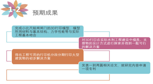 研究预期取得成果如图,研究结束后对研究成果进行分析整理,撰写实验报告一份,发表论文一至两篇,申请专利1项,提出实际水工建设中可行的3D打印方案,对水工建筑物3D打印进行“合规设计,完成混凝为原材料的小比尺船闸闸室3D打印模型制作,且模型力学性能满足实际工程的设计要求得出实际工程3D打印技术分块、分期打印建筑物的一般可行的方法