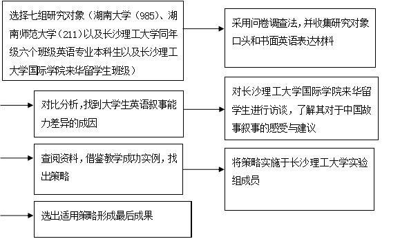 大学生英语叙事能力的培养不仅能提高大学生学习英语的积极性,改善学习的氛围,同时能提高大学生的英语语言表达能力逻辑思辩能力。最重要的是:大学生运用规范流畅的英语对“中国故事”进行叙事,让“中国故事”走向世界。因此,本项目的主要研究内容有: