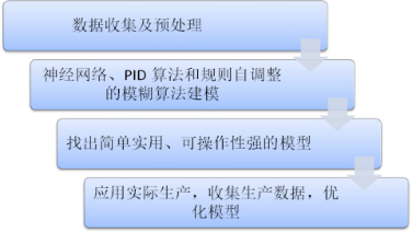 数据采集及预处理→利用统计软件对数据进行描述性统计分析,为建模提供思路使用神经网络、PID 算法和规则自调整的模糊算法进行建模寻找最优模型模型应用于实际生产,收集生产数据,进一步优化模型解决实际问题,带来经济效益,