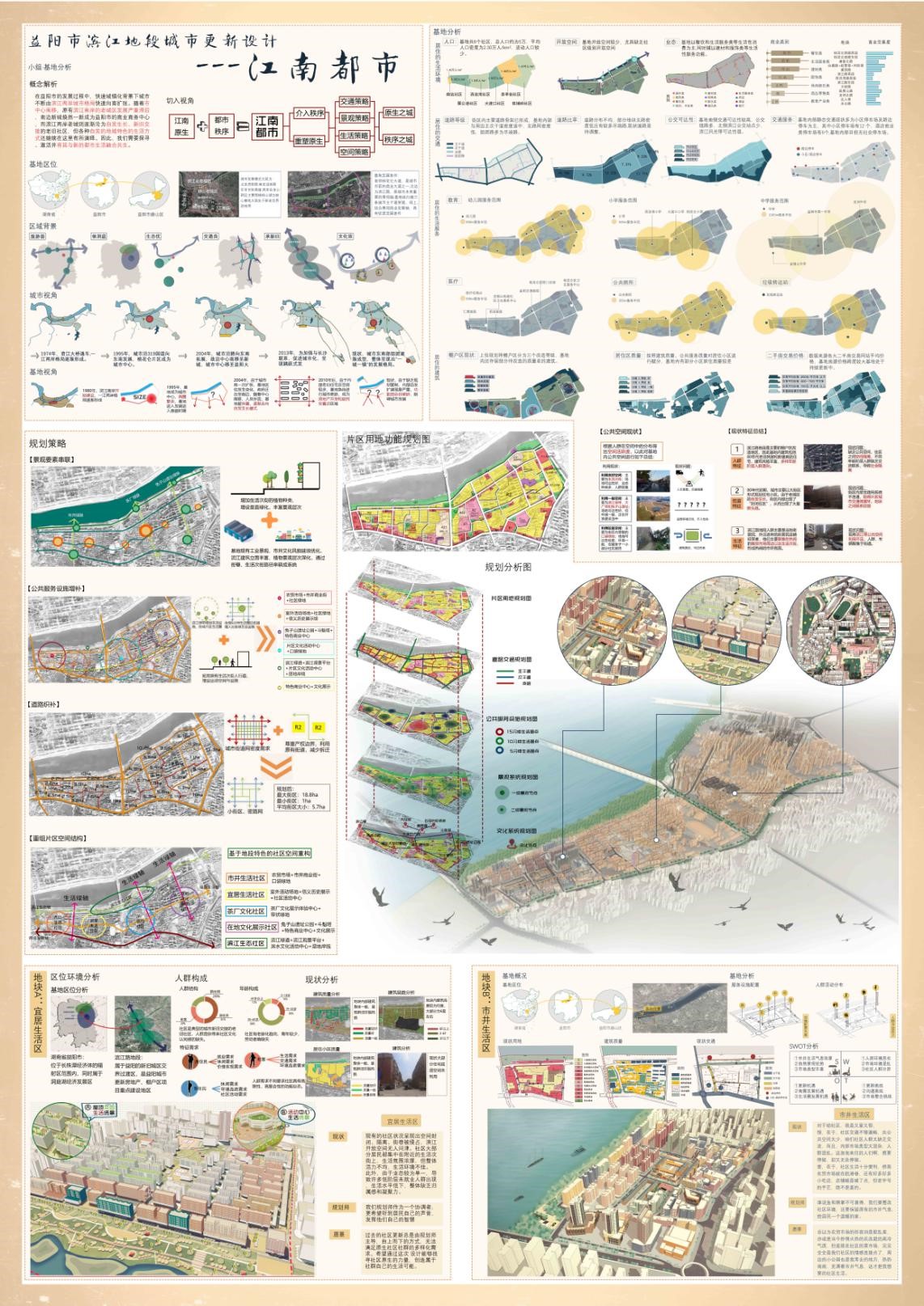 由邓斌、欧阳慧婷、黄铭东、张婷婷四位同学完成的两组方案均为益阳市滨江路地段老旧社区的更新设计。第一组方案“江南都市”提出“社群自组织”目标导向的概念,它强调社群性和自组织性,针对现状提出三大策略,一是市井重塑,二是空间交融,三是时空的共享。将基地更新改造成具有人间烟火味和市井小生活社区,以达到社会关系的共存,人群的共生以及空间的共享,最终实现“共建、共生、共享”的社区生活新模式。第二组方案“不建不康”基于中西医疗法理念,选取典型空间进行定性和定量相结合诊断分析,注重生活氛围的营造和特色业态的改造,以期获得健康的人居环境。两组方案概念新颖独特,得到专家一致好评。经过一天的方案展示、学生汇报、专家评审等环节,最终分别取得一等奖和三等奖的好成绩。本次竞赛成绩反映了我院城乡规划专业的办学实力,也凸显了永利官网学生的专业素养。我系将再接再厉,为社会培养高素质的人才,为国家城乡建设做出应有的贡献。