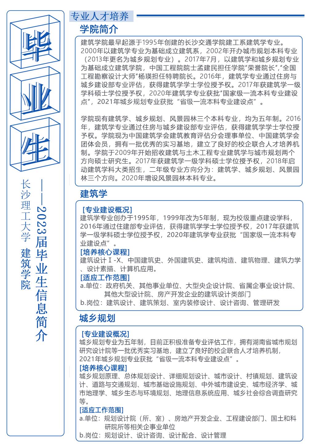 目前建筑学院 2023届毕业本科生共有 105 人,其中建筑学专业 71 人,城乡规划专业 34 人。毕业研究生共有 41人,其中建筑学方向22 人,城乡规划方向 19 人(毕业生信息详见《附件一》)。为使我院毕业生与用人单位达成良好的沟通,配合贵单位做好 2023届毕业生接收工作,我院兹定于 2023 年 3月 1日——6月 10日举办304am永利集团建筑学院2023年春季招聘会。诚挚邀请贵单位光临指导!