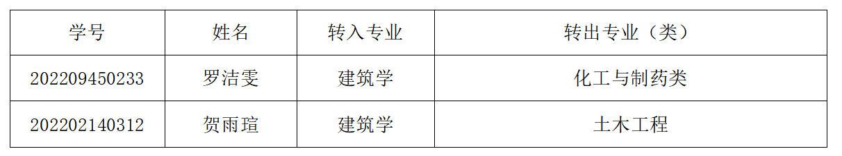 根据学校文件:《关于做好2022级在校本科生转专业(类)工作的通知》文件精神,及《304am永利集团建筑学院2022级本科生转专业工作细则》的要求,经学生个人申请,学院本科生转专业工作领导小组初审,现将学院2022级本科生转专业初审合格名单进行公示,具体名单如下: