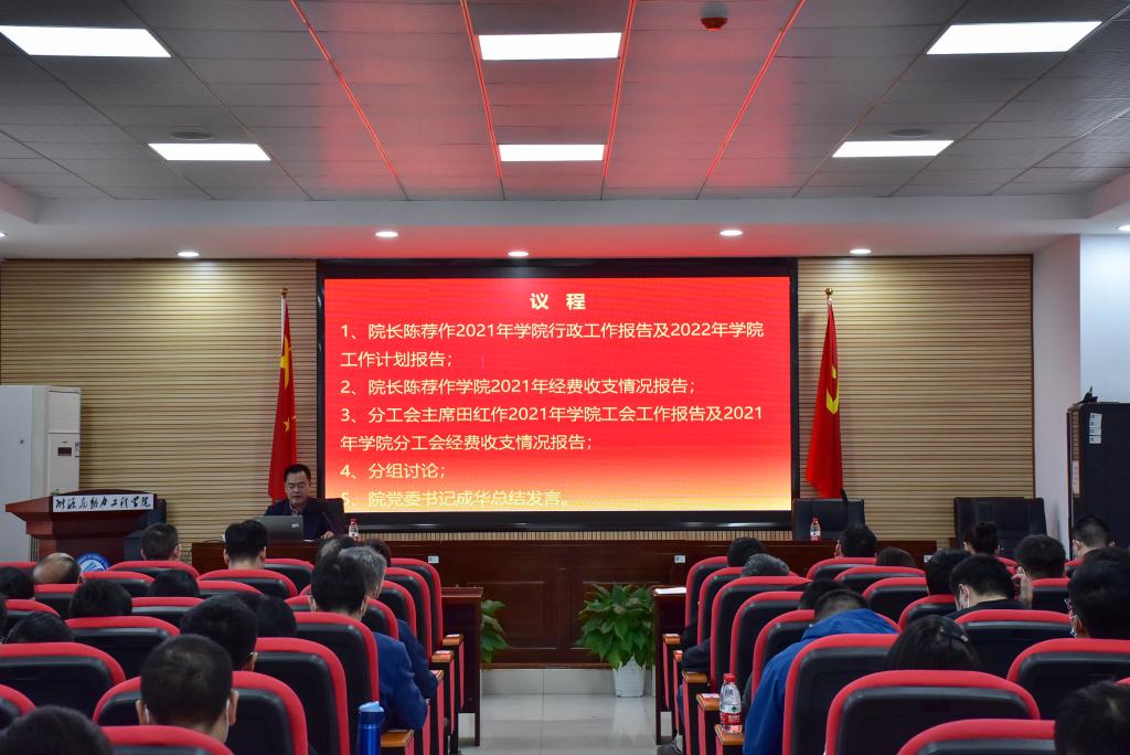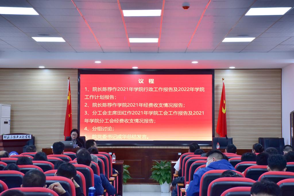 院长陈荐就2021年学院行政工作及2022年学院工作计划作报告,并报告了学院2021年经费收支情况。院工会主席田红就2021年学院工会工作及2021年学院分工会经费收支情况作报告。