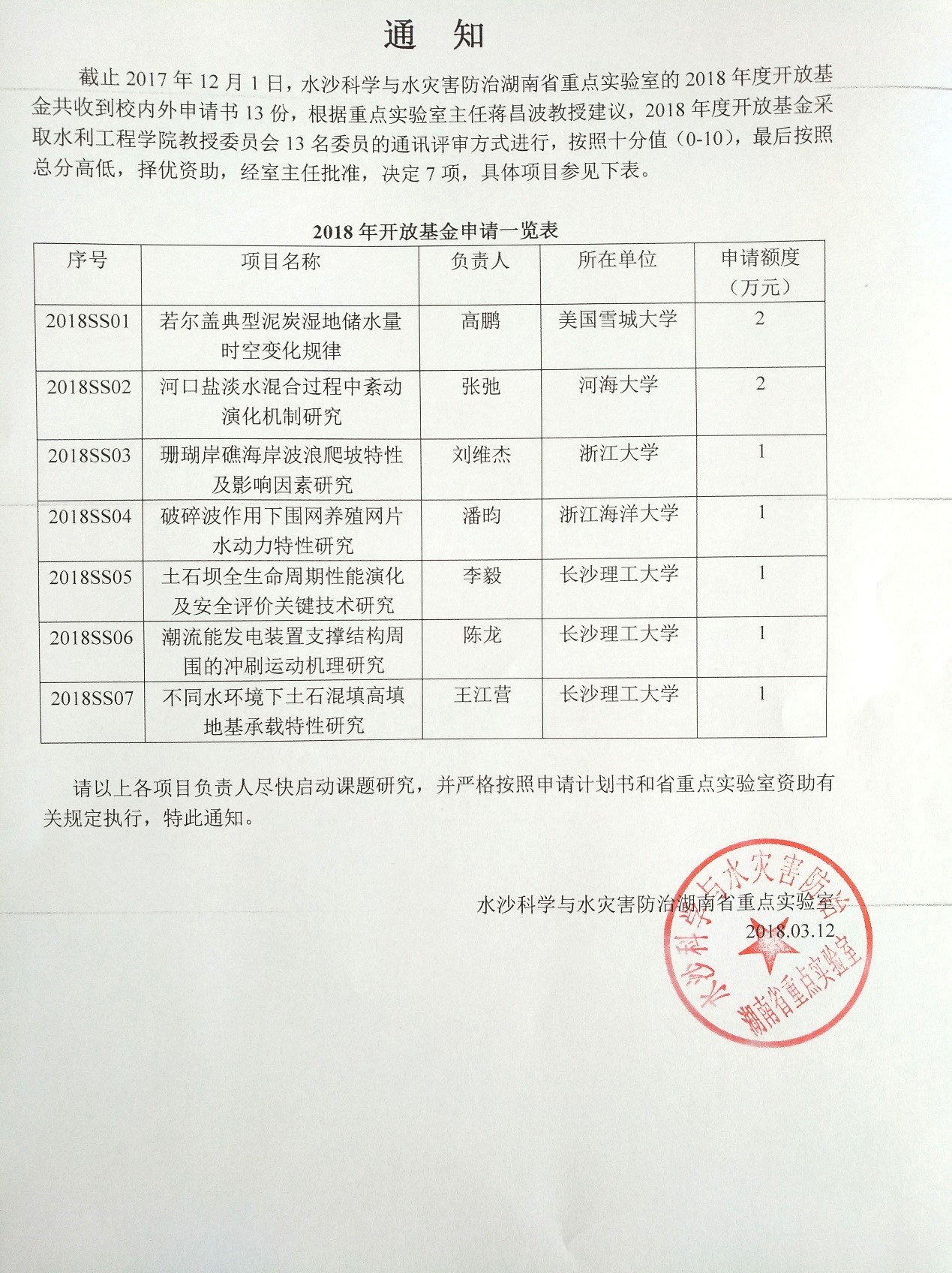 关于申请2019年度水沙科学与水灾害防治湖南省重点实验室开放基金的通知