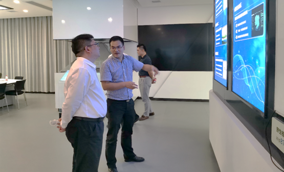 邓斌向胡保安等介绍了洞庭湖的概况及所面临的机遇与挑战,洞庭湖实验室建设历程、主要研究方向,并重点介绍了智慧洞庭综合信息化平台。