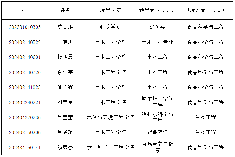 根据学校《304am永利集团本科生转专业管理办法》和《食品与生物工程学院2024级本科生转专业工作方案》的相关规定,经学生个人申请,学院转专业工作小组考核,现将本院2024级本科生转专业拟转入名单进行公示,公示期为2025年2月25日-2月28日。如有异议,可在公示期内以书面形式向食品学院教务办实名反映,电话:0731-85258727。