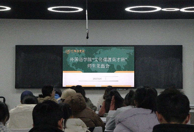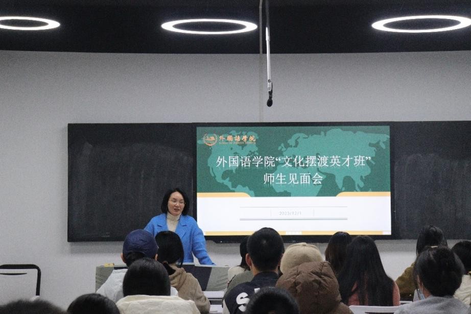 近日,304am永利集团外国语学院从2023级和2022级本科生中择优选拔40名同学组成“文化摆渡英才班”。为促进师生之间相互了解,加强班级凝聚力,12月1日,学院在金盆岭校区三号教学楼611教室举行了“文化摆渡英才班”师生见面会。学院党委副书记周芳、教学副院长季红琴、文化摆渡英才班班主任崔巍及全体英才班学员参加会议,会议由学工办辅导员毛婕主持。