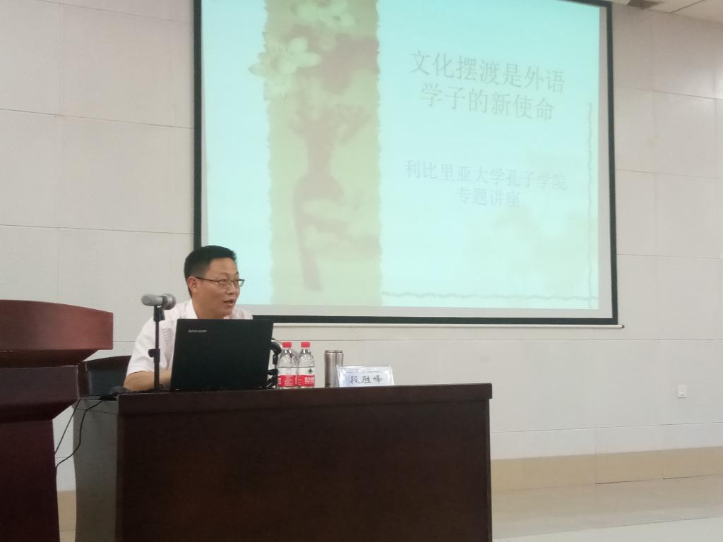 简短的启动仪式之后,段胜峰作首场报告。他以“文化摆渡是外语学子的新使命”为题,结合他在利比里亚大学孔子学院三年多的工作经历,详细介绍了我国文化“走出去”战略和孔子学院项目,以丰富的实景图片再现了在利比里亚教授汉语、推广中华文化、加强民间交流等“文化摆渡”工作。他曾担任永利官网利比里亚大学孔子学院的首任中方院长。谈及孔院草创之时的艰辛,面临缺场地、缺学生、缺支持、缺理解的困境,他感慨万分,饱含深情地说道:“我的背后是祖国,这种朴素的爱国情怀激励着我必须去奋斗。祖国把我派到这里来,就是让我来奋斗的!”报告会现场不时响起热烈的掌声。