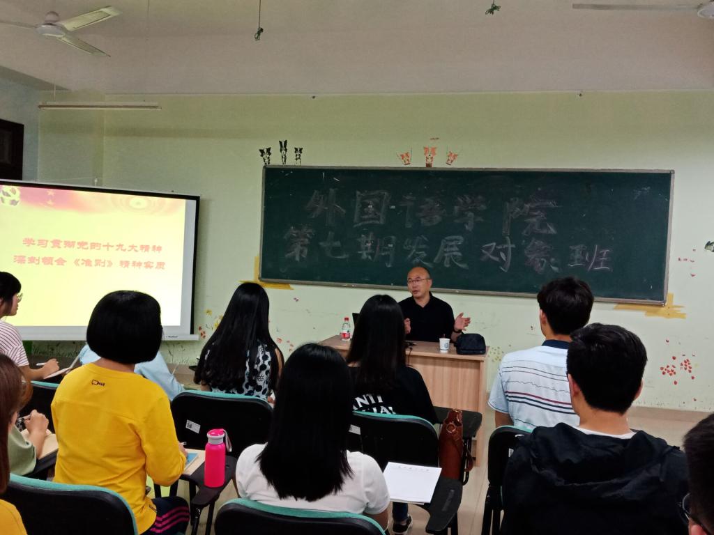 5月9外国语学院期发展对象培训班第一讲在文科楼A503教室开讲,学院党委书记甘为主讲“党内政治生活的若干规定”。