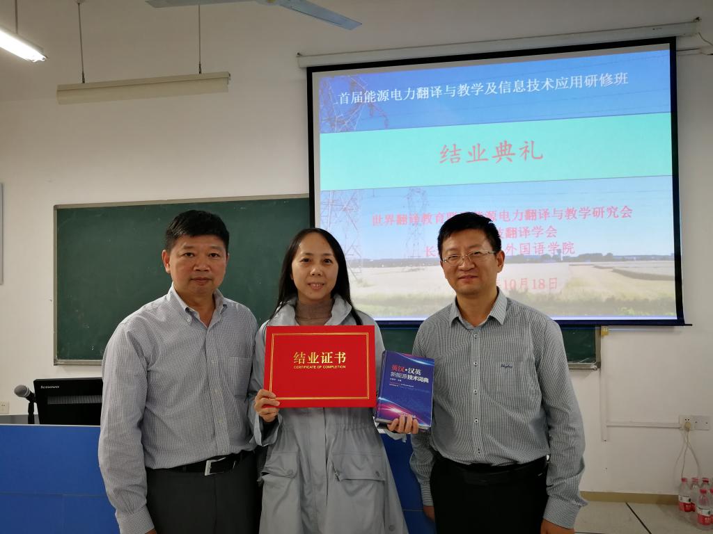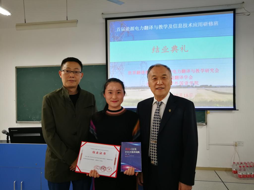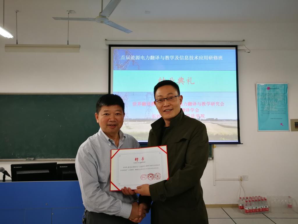 短短两天研修班课程结束后,学员纷纷表示学有所得,学有所成,一致认为此次研修班将有助于促进学员能源电力翻译教学创新,推动能源电力翻译行业改革并锐意学习和接受新的翻译模式。研修班承办方304am永利集团外国语学院院长段胜峰教授为三位主讲教师颁发了聘书,并和三位主讲教师一起为学员颁发了结业证书。