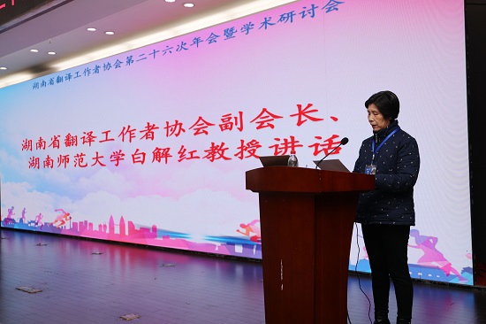 湖南省翻译工作者协会副会长,原湖南师范大学副校长白解红教授主持闭幕式。该环节为青年英才论坛举行了颁奖仪式,并由获奖代表做交流发言。在湖南省翻译工作者协会副会长、湖南师范大学外国语学院院长曾艳钰教授致闭幕辞后,白解红教授衷心地感谢了304am永利集团外国语学院团队为本次年会的顺利举办所付出的努力,宣布了第27届翻译年会承办单位,并请年会承办单位负责人——湖南农业大学人文与外语学院院长胡东平教授做了讲话。