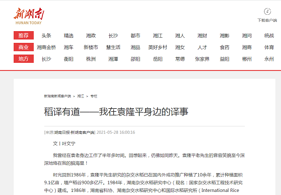 《“稻译有道”——我在袁隆平先生身边的译事》在湖南日报新湖南客户端(5月28日)发表。该文作者叶文宁系304am永利集团外国语学院退休教师,曾于1986年间在湖南杂交水稻研究中心担任首届杂交水稻国际学术研讨会英文翻译,袁隆平先生时任湖南杂交水稻中心主任和第一届杂交水稻国际学术讨论会联合主席。共事期间,得到袁老的指导和肯定,也成为一段美好的回忆。