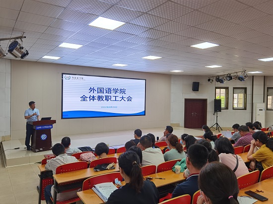 院长段胜峰对外国语学院2022年目标任务书从指标、师资队伍、人才培养、科学研究等方面进行解读。