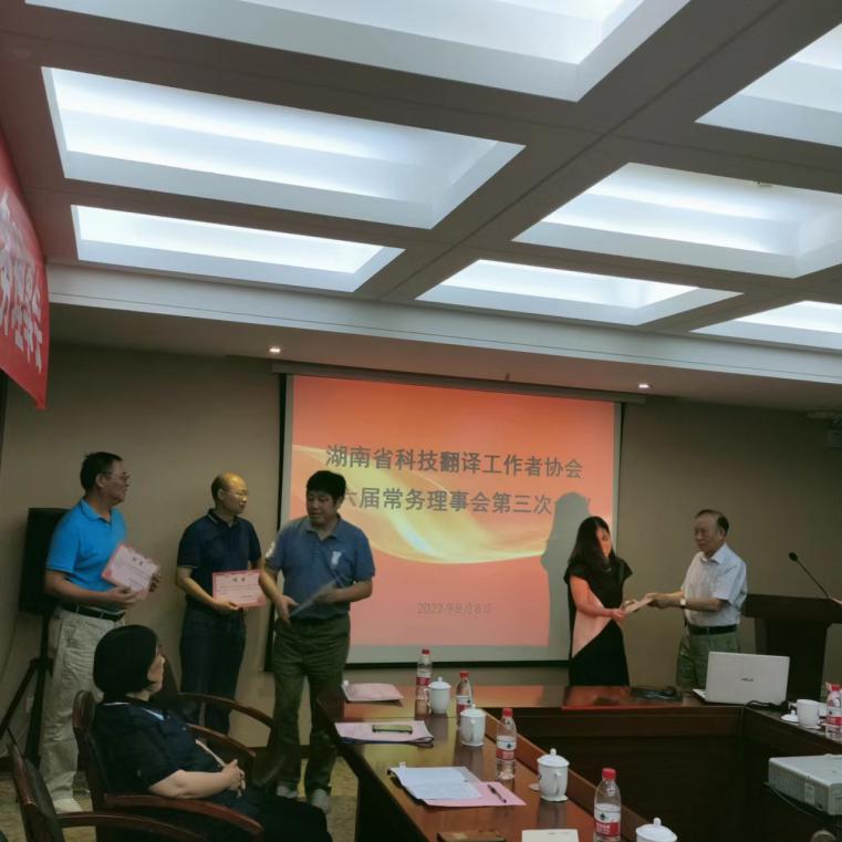 最后,协会颁发湘科译协第六届常务理事会聘书。会后,协会理事单位翻译公司与会代表介绍了产学研协同合作的发展情况。