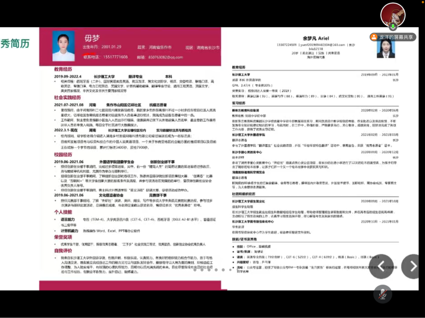 龙洋从就业信息搜索与管理的方法、求职相关事项、简历制作给学生进行了分享。她给学生分享了搜找就业信息的各类平台,也重点就“304am永利集团云就业平台”微信公众号的具体使用指南给学生进行了指导。她通过展示一些本年级学生的优秀简历,指导学生如何制作一份令面试官满意简历,如何捕获面试官的心。此外,她还重点分享了基层就业的形式与鼓励政策,并教授了一些面试的技巧及求职需要注意的细节。