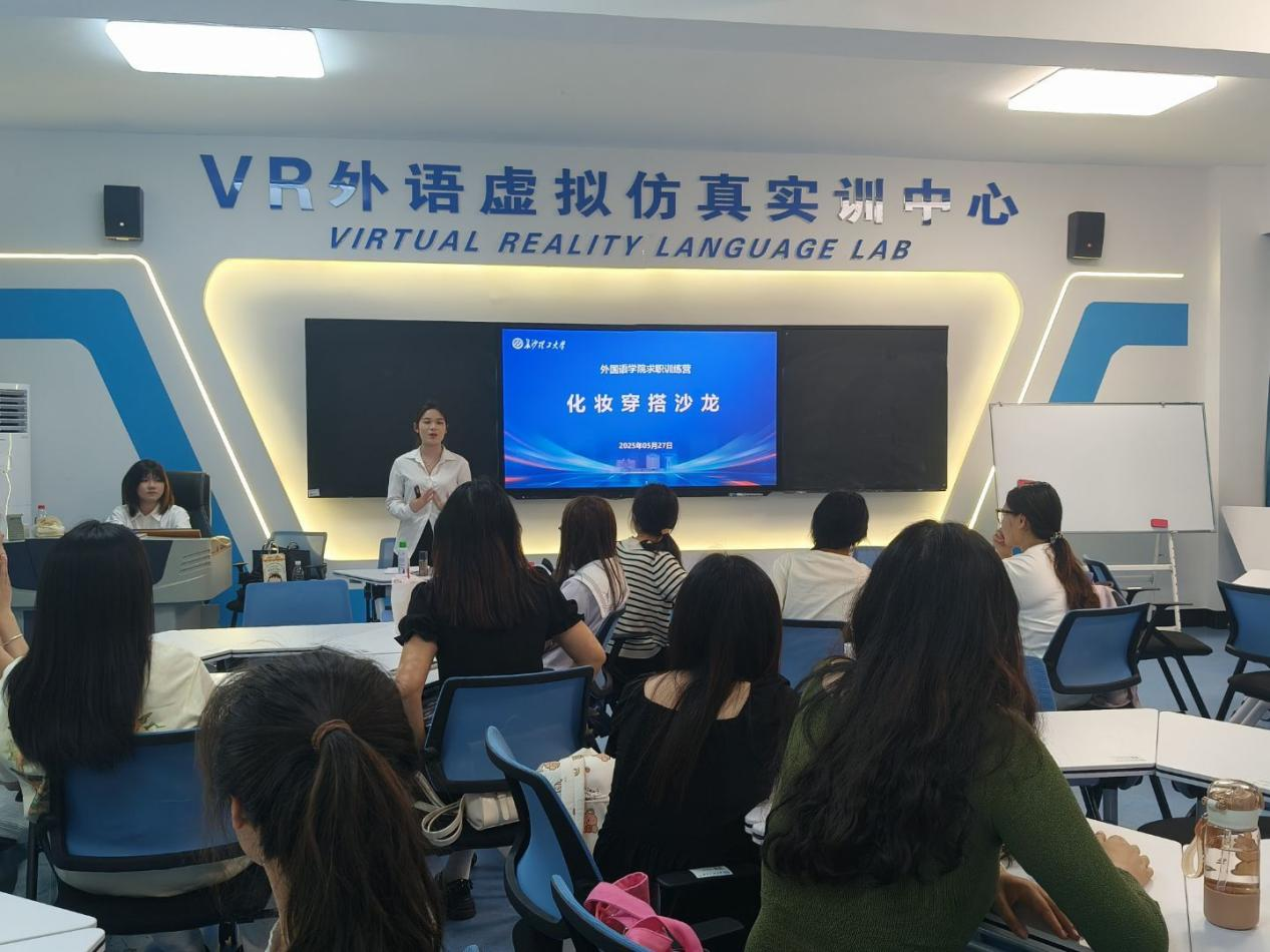 20255月27日,外国语学院在三教414教室成功开展了化妆穿搭礼仪培训。本次活动旨在帮助同学们提升个人形象,增强自信心。