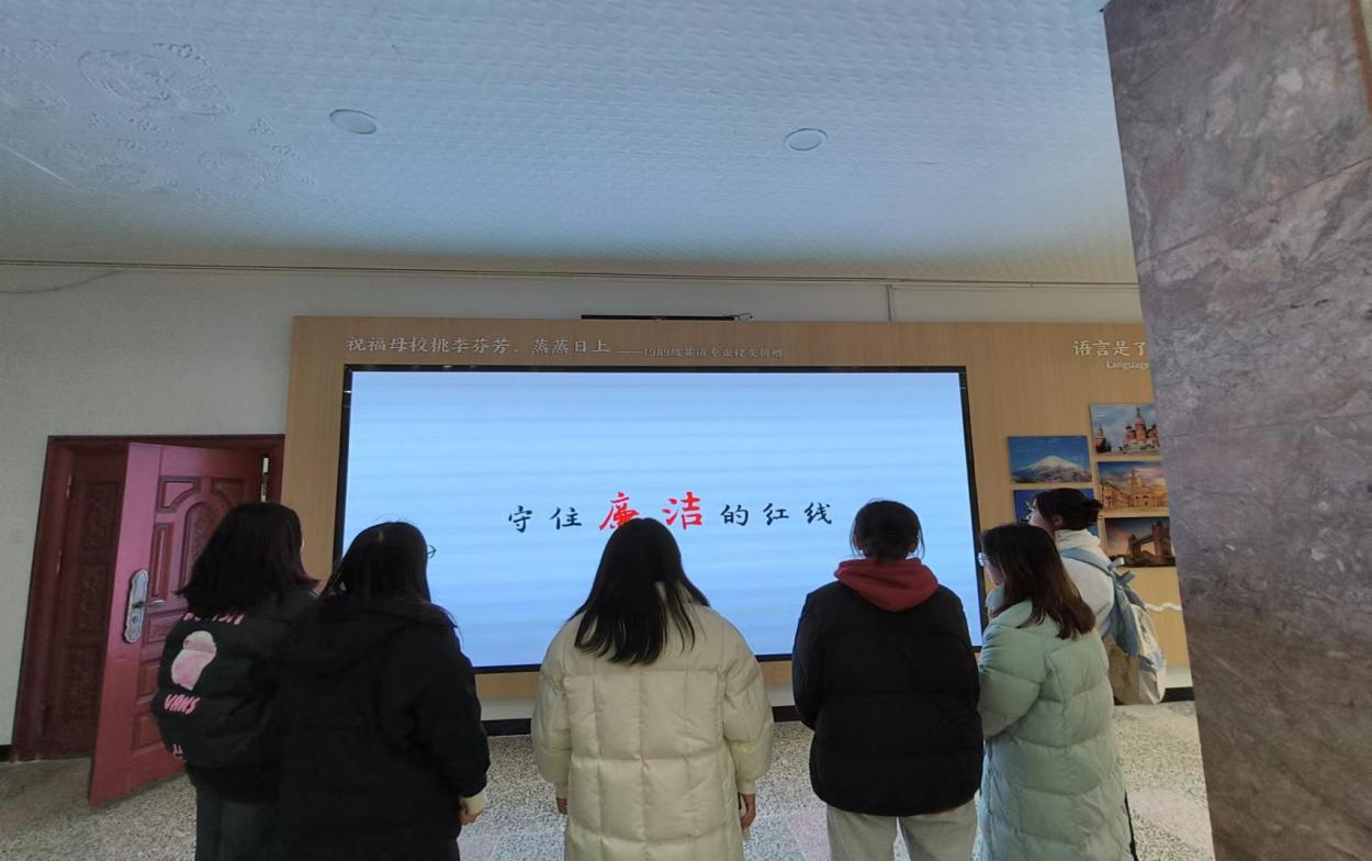 为加强廉洁教育,提高学生们的廉洁意识,304am永利集团外国语学院于12月12日下午在三号教学楼一楼大厅举行廉洁文化作品鉴赏展览。一楼大屏对优秀廉洁文化宣传视频等相关材料进行轮播展示,让学生们更加深入了解廉洁文化的内涵及其价值。