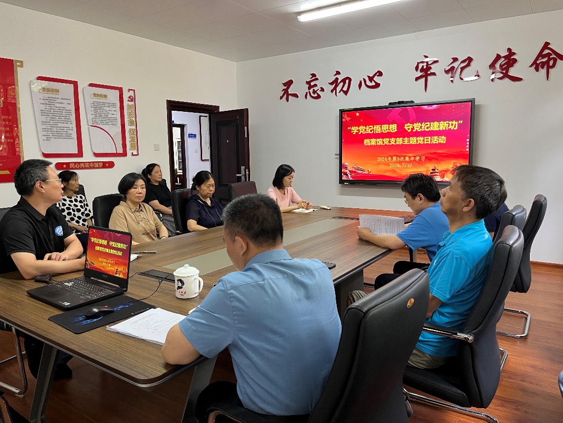 7月10日,档案馆党支部组织开展了“学党纪悟思想 守党纪建新功”主题党日活动。会议由支部副书记王任飞主持,档案馆全体职工参加了此次集中学习。