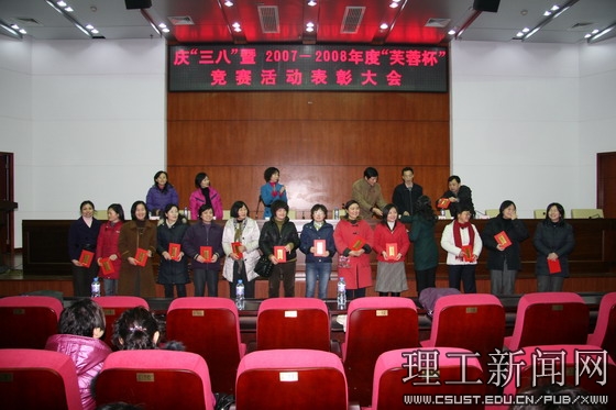 在第99个“三八”国际妇女节到来之际,学校工会为表彰2007-2008年度“芙蓉杯”竞赛活动中涌现出来的先进集体和个人,调动广大女教职工的工作积极性,激发爱岗敬业精神,营造欢乐、和谐的校园氛围,于3月6日下午在图书馆报告厅举行了隆重的庆“三八”暨2007—2008年度“芙蓉杯”竞赛活动表彰大会。近300名女教职工代表、各分工会主席参加了大会。