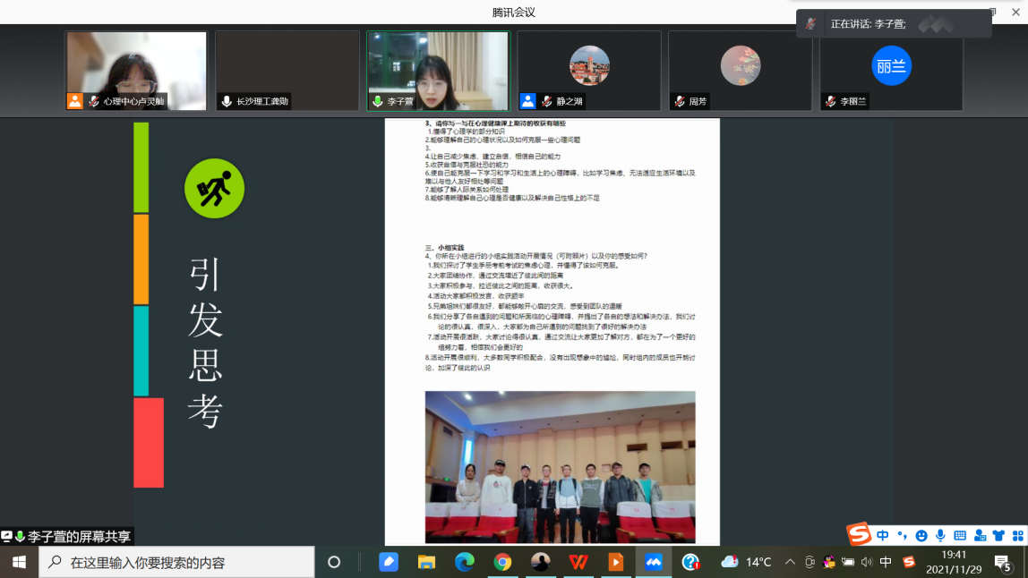 线上场中,首先由李子萱老师分享翻转课堂在课程中应用的经验,随后新任课教师韩淑娟、楚艳鸽分别围绕“压力”和“恋爱”两章片段授课,参会任课教师展开讨论。教学督导专家熊丽君教授对此次教研活动的形式和内容给予了高度评价,鼓励新任课老师继续保持热情的教学态度,持续学习专业知识和教学技能,努力提升课堂教学效果。