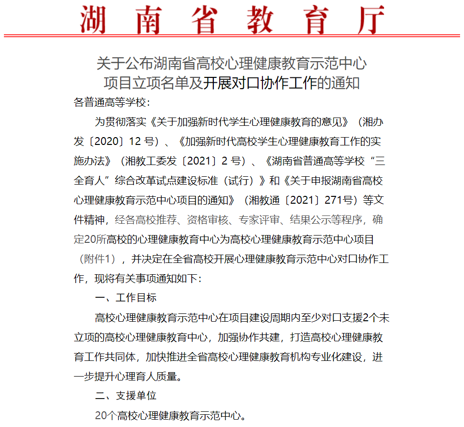 为加快推进全省高校心理健康教育机构专业化建设,进一步提升心理育人质量,湖南省教育厅开展了高校心理健康教育示范中心项目,并决定在全省高校开展心理健康教育示范中心对口协作工作。经各高校推荐、资格审核、专家评审、结果公示等程序,永利官网心理健康教育中心于2021年12月成功立项湖南省高校心理健康教育示范中心。