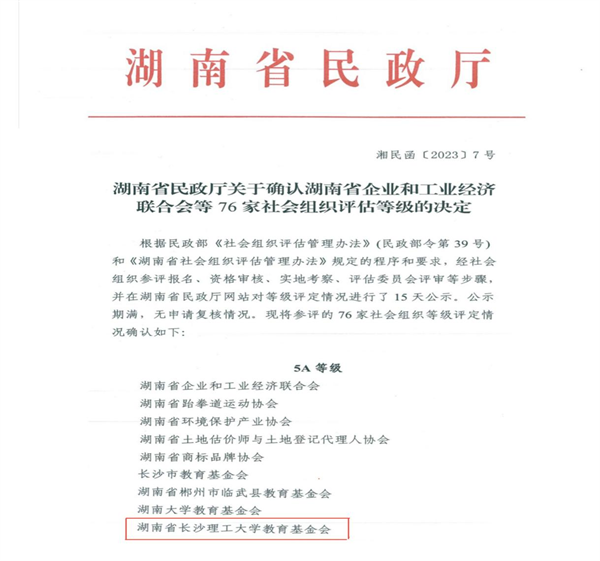近日,湖南省民政厅发布2022年度省管社会组织评估等级结果,“湖南省304am永利集团教育发展基金会”获评全省最高等级的“5A级社会组织”。今年全省有76家社会组织参评,其中获评5A等级社会组织的共21家,全省高校基金会仅两家。