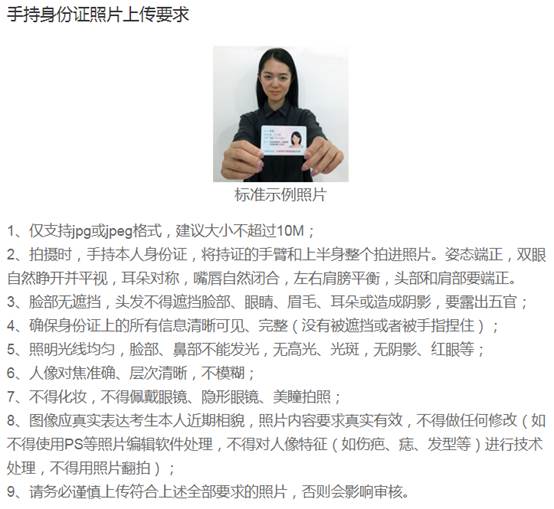 特别提醒:考生标准照和手持身份证照,均要求考生不得化妆,不得佩戴眼镜、美瞳隐形眼镜等;照明光线均匀,脸部无高光、光斑,无阴影、红眼等;头发不得遮挡脸部或造成阴影,要露出五官,并能如实地反映本人近期相貌,照片内容要求真实有效,不得做任何修改(不使用图片编辑软件,不使用照片翻拍)。在照相馆或其他地方拍照时,考生也不得化妆,不使用图片编辑软件处理照片。