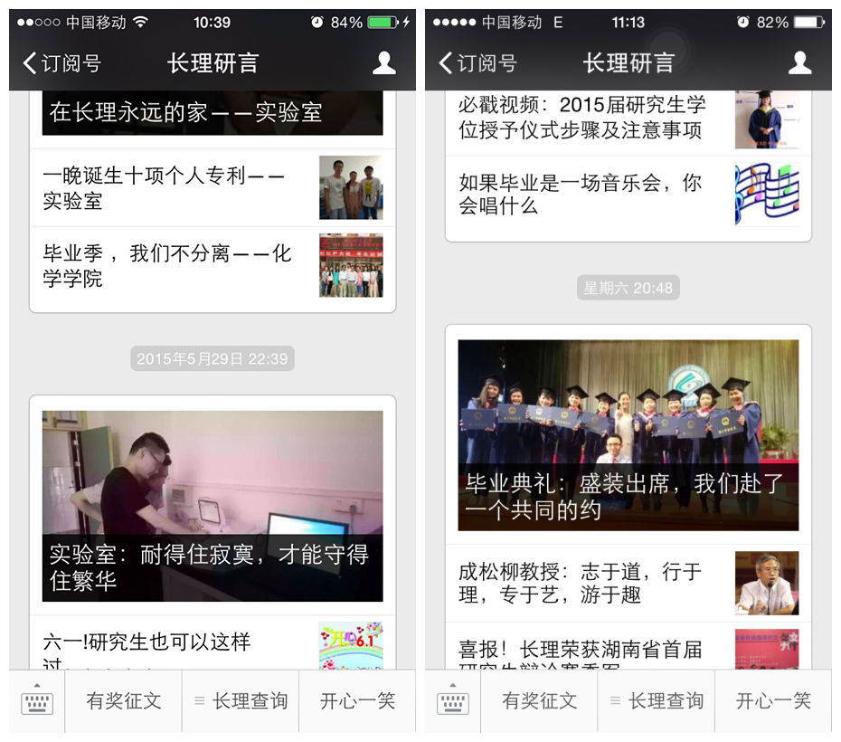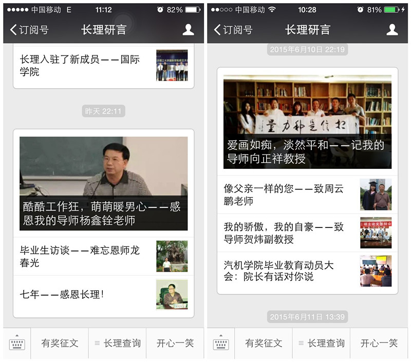 活动一经推出后,收到了很多毕业生的投稿,“长理研言”微信公众号的关注人数与日俱增,每天的点击量达500余次。毕业生刘聪娜的稿子中写到:“周老师治学严谨,甘于奉献,以人格魅力引导和熏陶学生。”谢小迪在接受研言记者采访时说:“实验室是自我修行自我提高的学习天堂,耐得住寂寞,才守得住繁华。”每一篇稿子都讲述着与导师之间浓厚的师生情谊,每一个故事都倾诉者毕业生的依依不舍,每一张照片都折射出研究生生活的点点滴滴。其中《实验室:工科女生当男生使,男生当……》阅读量为918人,《我的骄傲,我的自豪——致导师贺祎副教授》阅读量为855人,《毕业典礼:盛装出席,我们赴了一个共同的约》阅读量为1424人。