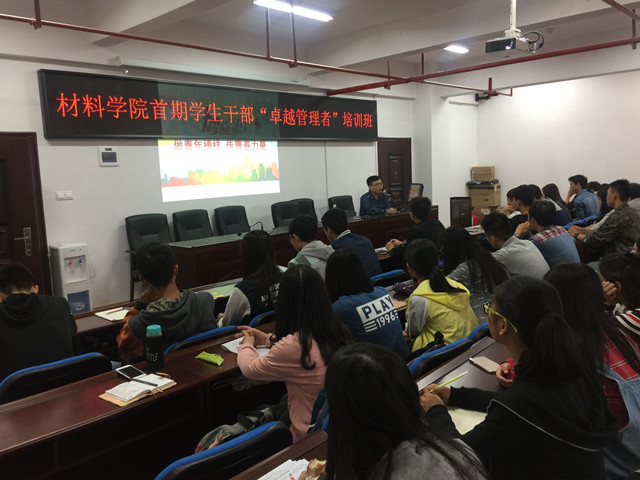 10月19日中午12:00,材料学院首期学生干部“卓越管理者”培训班在新能源楼一号楼会议室开讲。主讲人是校团委书记王学成,培训主题为“做青春榜样,传青春力量”。学院学工办唐青老师主持,学院团学会全体成员以及各班班委参加培训。